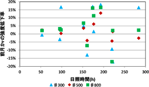 図-11 前月からの強度低下率と日照時間(月当たり)との関係